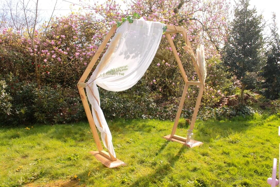 Cette arche de 2,20 m en bois artisanal de forme hexagonale est idéale pour votre cérémonie laïque, en fond pour prendre vos photos devant notre borne à selfie ou bien tout simplement en décoration.