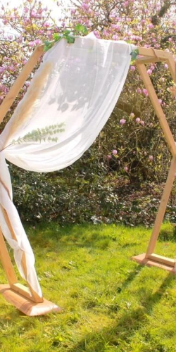Cette arche de 2,20 m en bois artisanal de forme hexagonale est idéale pour votre cérémonie laïque, en fond pour prendre vos photos, devant notre borne à selfie, ou bien tout simplement en décoration.